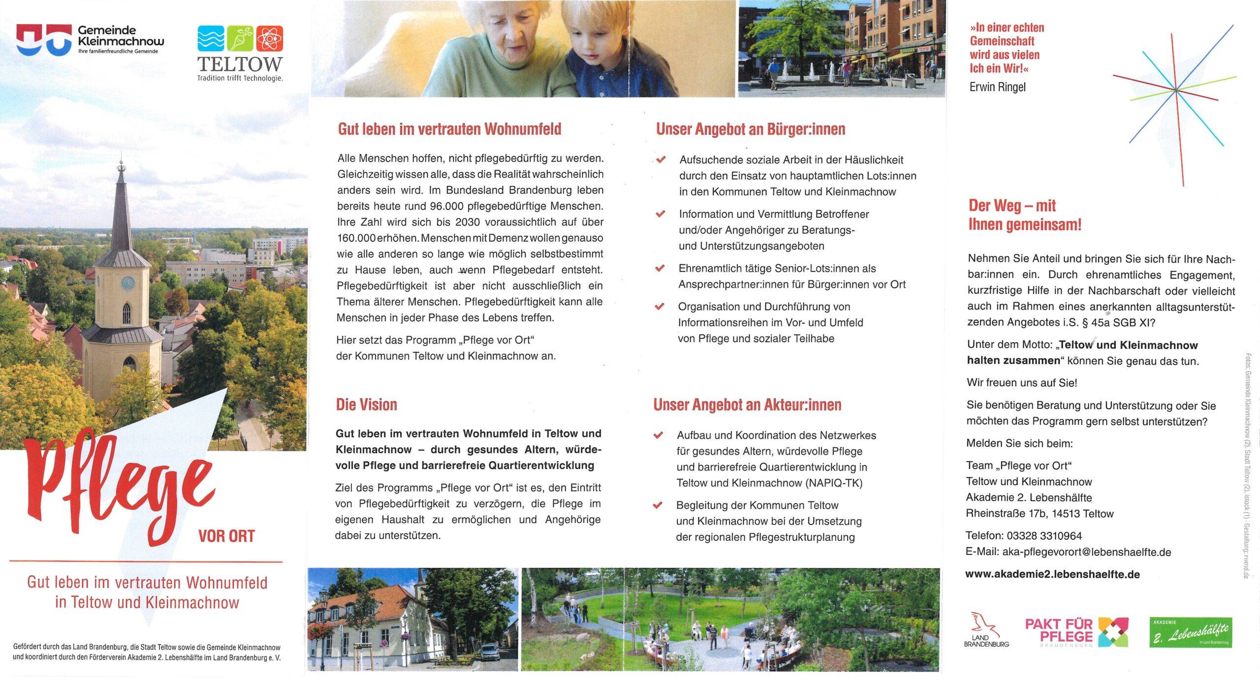 Gut leben im vertrauten Wohnumfeld in Teltow und Kleinmachnow durch altersgerechte Quartierentwicklung. Ziel des Programms „Pflege vor Ort“ in Teltow und Kleinmachnow ist es, den Eintritt von Pflegebedürftigkeit zu verzögern, eine Pflegebedürftigkeit im eigenen Haushalt zu ermöglichen und Angehörige dabei zu unterstützen.